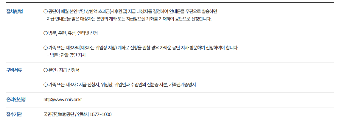 국민건강공단 홈페이지에서 신청 가능 "개인민원" → "급여" → "본인부담상한액 초과금 신청" 메뉴에서 신청서 작성