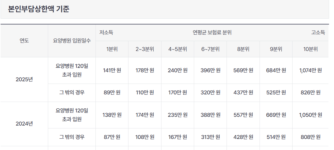 | 2025년 | 요양병원 120일 초과 입원 | 141만 원 | 178만 원 | 240만 원 | 396만 원 | 569만 원 | 684만 원 | 1,074만 원 |