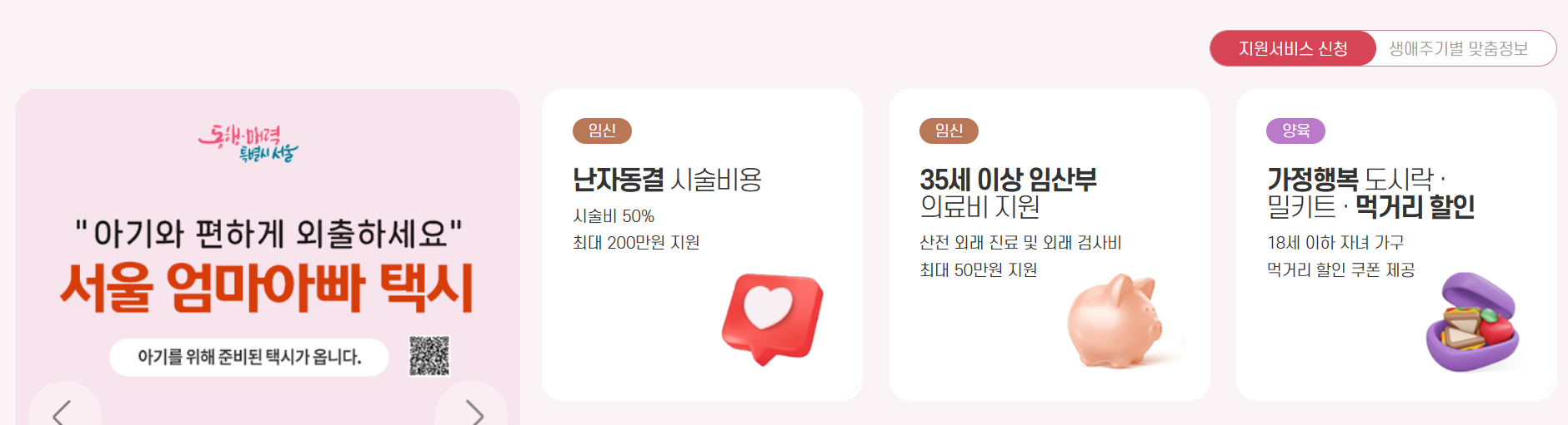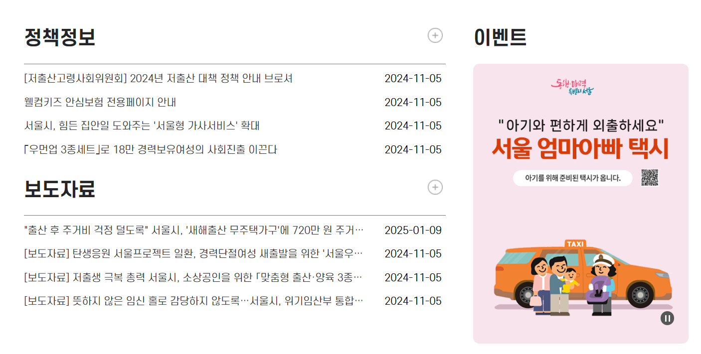 아이를 가진 엄마아빠가 카시트와 유모차가 있는 대형 승합차를 이용할 수 있도록 대형 승합 택시 서비스(서울엄빠택시)를 제공하며 12만원의 쿠폰(바우처)를 제공합니다.