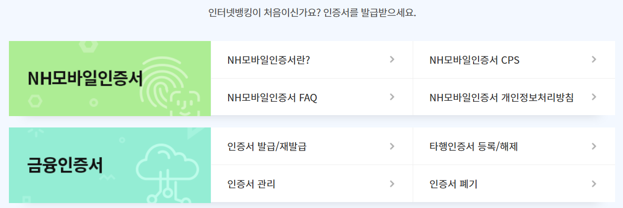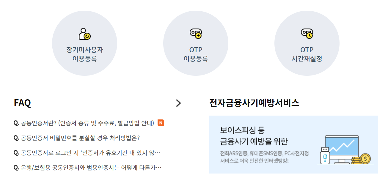 농협은행, 국민은행, 우리은행 등 은행은 거의 동일합니다. 인터넷 뱅킹 사이트 접속 로그인 후 ‘공인인증센터’ 클릭 ‘인증서 갱신’ 메뉴 선택 기존 인증서 선택 후 비밀번호 입력 본인 인증 진행 (휴대폰 인증 또는 보안 입력) 새 인증서 다운로드 및 저장