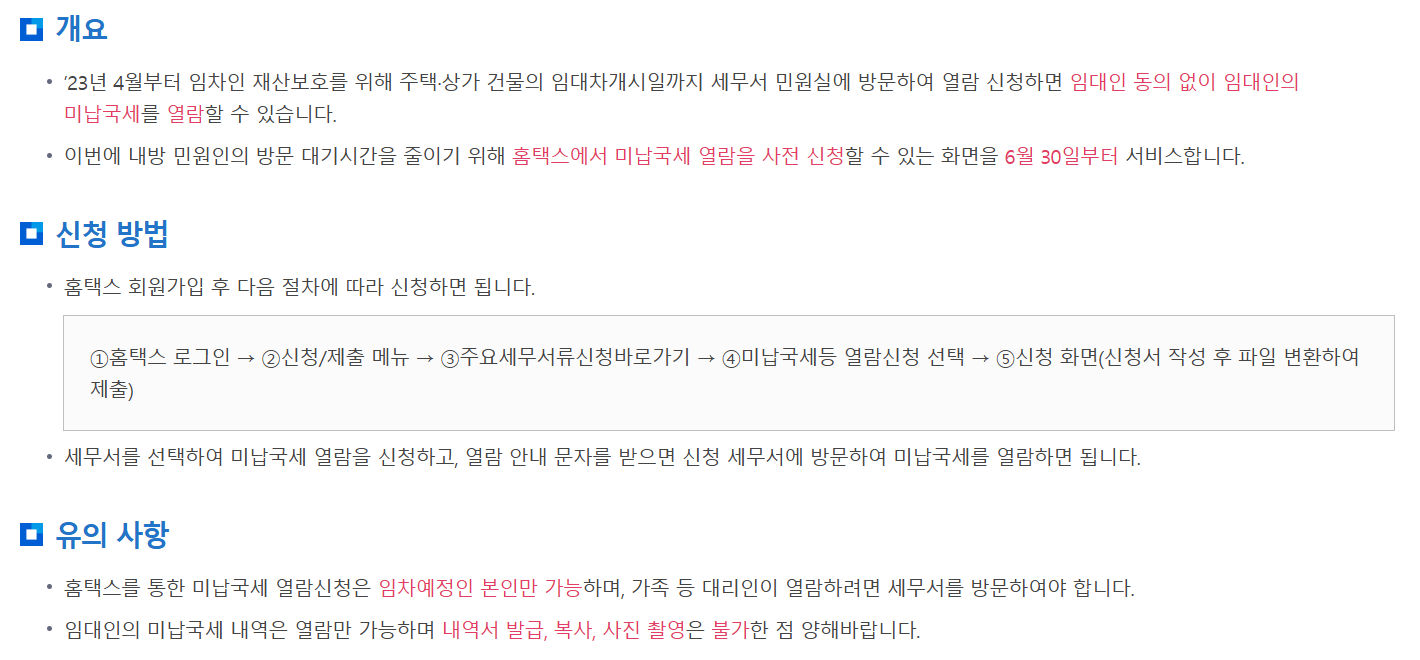 - 홈택스를 통한 미납국세 열람 신청은 임차인 본인만 가능하며, 가족이나 대리인이 열람하려면 세무서를 직접 방문해야 합니다.