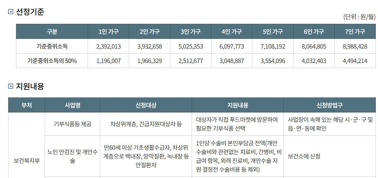 | 가구원 수 | 기준 중위소득 (100%) | 차상위계층 소득 기준 (50%) |