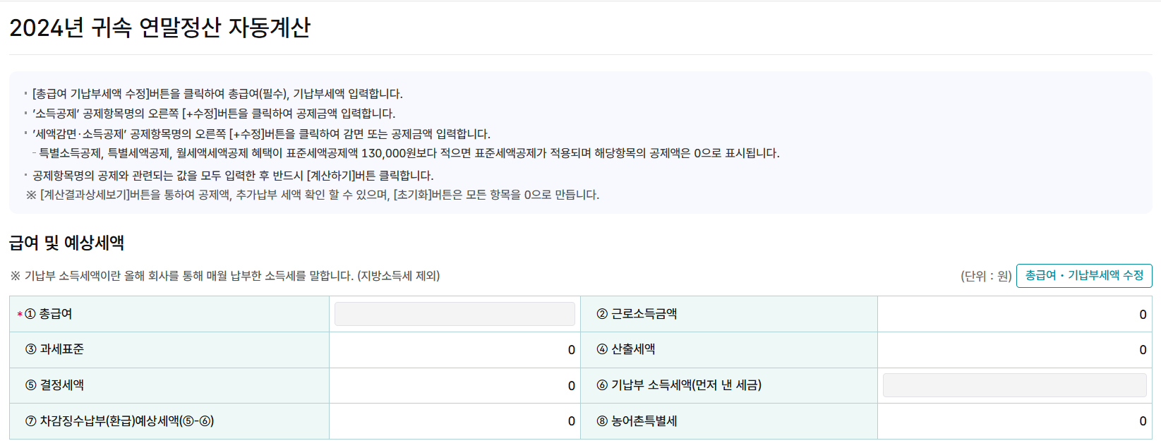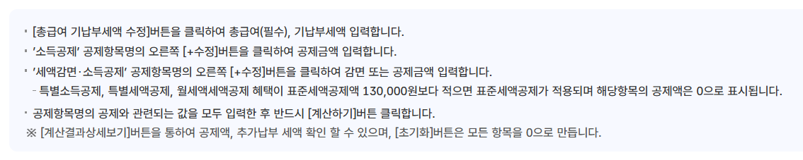 입력한 총급여와 기납부세액이 정확하지 않으면 환급금 예상치에 오류가 생길 수 있습니다. 지방세는 제외하고 국세만 입력해야 합니다.