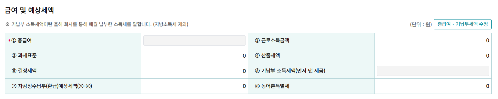 기납부세액: 지방세를 제외한 국세만 입력