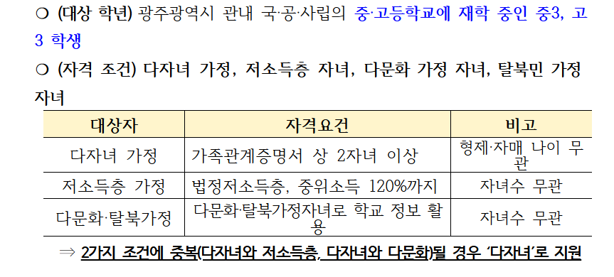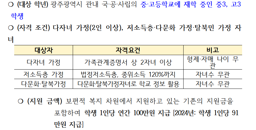 보다 자세한 문의는 재학 중인 학교 또는 광주광역시교육청을 통해 확인하실 수 있습니다. 또한, 학교에서는 신청 대상자에게 개별 안내문과 함께 신청 절차를 안내하고 있으므로 학부모님들께서는 자녀를 통해 공지사항을 확인해보시는 것이 좋습니다.