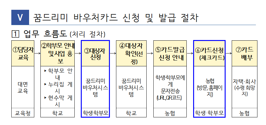 학생의 가정환경에 따라 지원 대상은 다자녀 가정, 저소득층 가정, 다문화 및 탈북민 가정의 자녀로 구성되며, 전용 체크카드(농협 꿈드리미 체크카드)를 통해 포인트 형태로 지급됩니다.