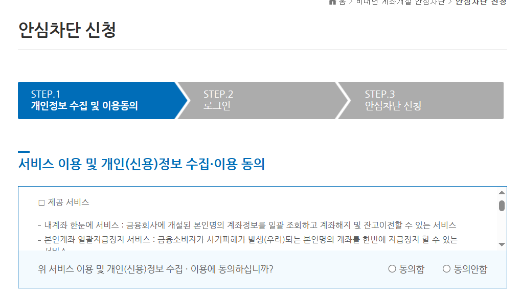 비대면 계좌개설 안심차단 서비스는 금융소비자가 본인의 명의로 원치 않는 계좌가 비대면 방식(모바일, 인터넷 등)으로 개설되는 것을 미리 차단할 수 있는 서비스로 누구나 무료로 이용하실 수 있습니다.