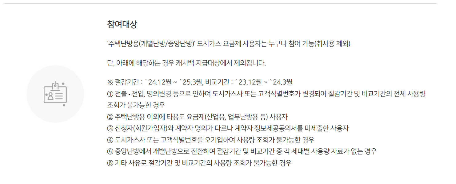 2025년 도시가스 에너지 캐시백은 기준을 충족하는 가구를 대상으로 적용됩니다.
