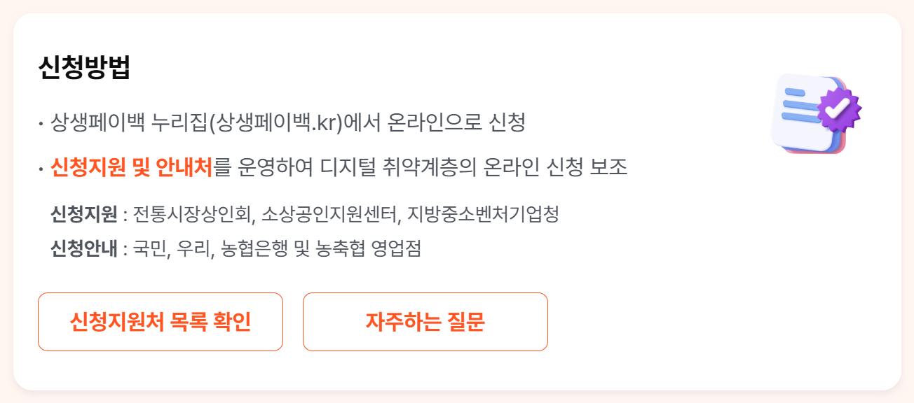 신청 지원 기관은 전통시장상인회, 소상공인지원센터, 지방중소벤처기업청이며, 국민은행·우리은행·농협은행 및 지역 농축협 영업점에서도 안내를 받을 수 있습니다. 온라인 신청이 어렵거나 지원이 필요한 분들은 해당 기관을 통해 도움을 받을 수 있습니다.