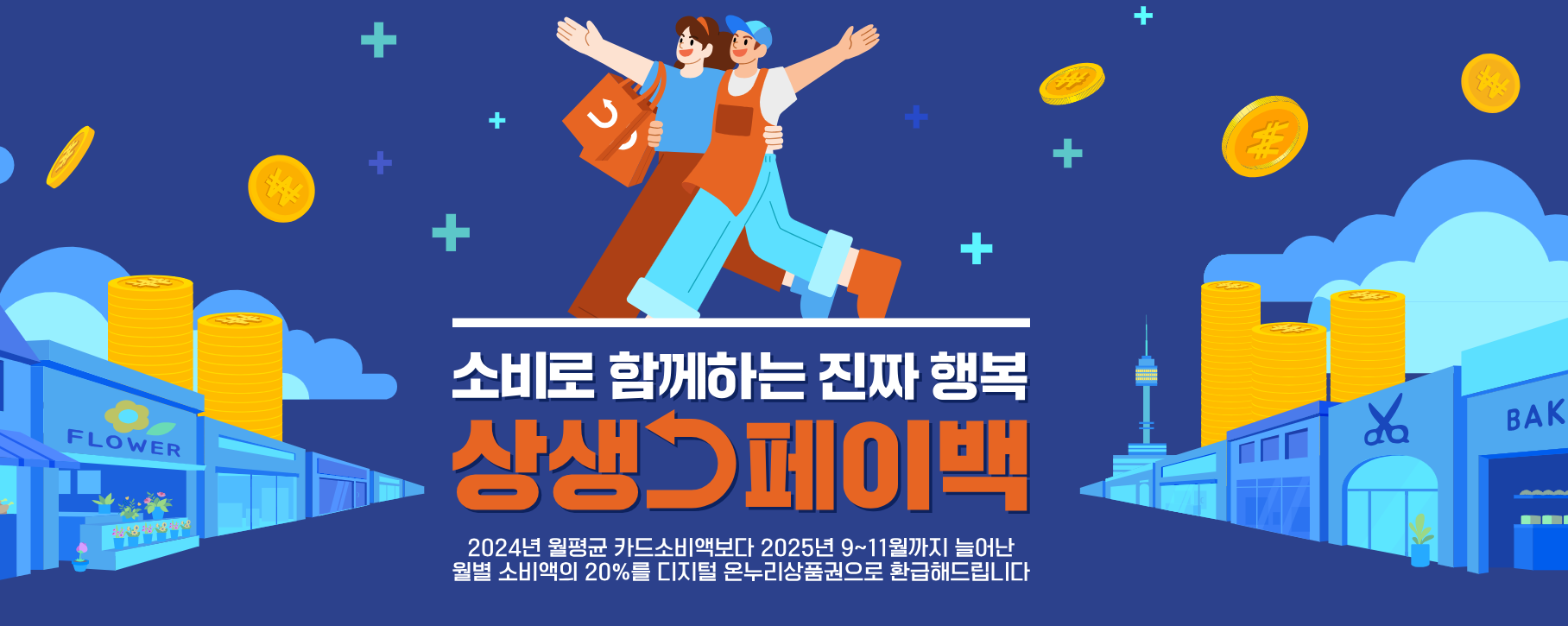 2025년 9월부터 11월까지 한시적으로 ‘상생페이백’ 제도를 운영합니다. 상생페이백은 카드 사용 증가분의 일부를 디지털 온누리상품권으로 환급하는 방식입니다.