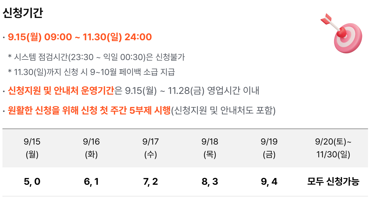 신청 초기에는 신청자가 몰리는 것을 방지하기 위해 5부제가 운영됩니다. 신청 첫 주인 9월 15일부터 9월 19일까지는 출생연도 끝자리 기준으로 신청이 제한됩니다. 예를 들어 출생연도 끝자리가 5와 0인 경우 9월 15일, 6과 1인 경우 9월 16일에 신청할 수 있습니다. 9월 20일부터는 모든 국민이 자유롭게 신청할 수 있습니다. 5부제는 온라인 신청뿐만 아니라 지원 기관에서도 동일하게 적용됩니다.