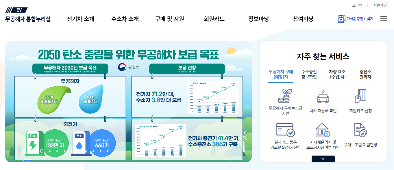전기차·수소차 구매 지원정책과 보조금 신청은 물론, 충전 인프라 안내, 회원카드 및 결제카드 신청, 각종 정책 및 법령 안내까지 한 곳에서 통합적으로 제공됩니다.