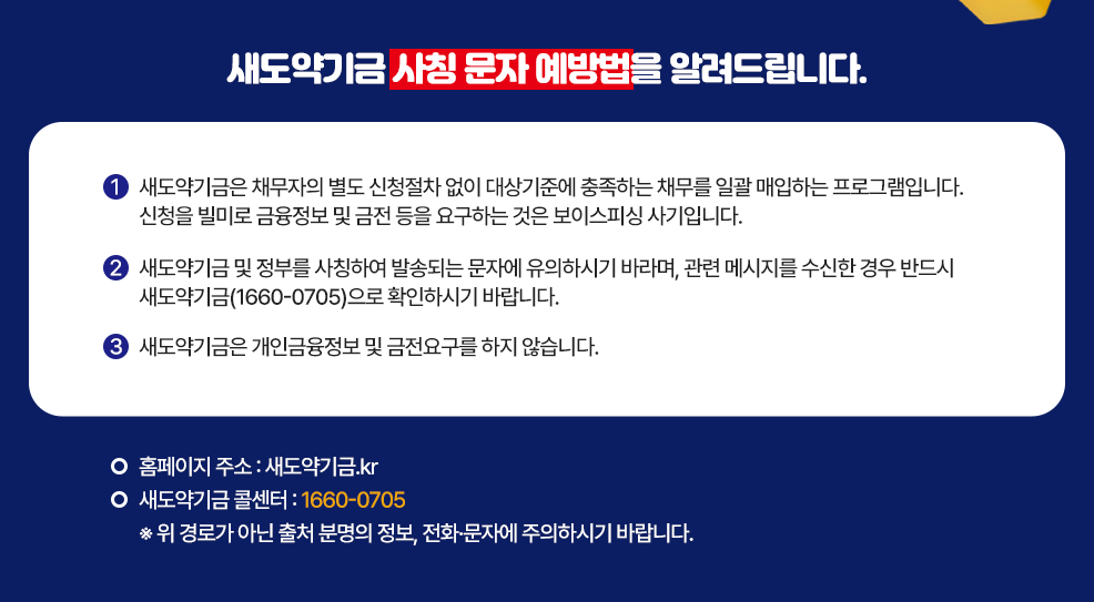 금융 채무로 어려움을 겪는 소상공인들을 돕기 위해 ‘새도약기금’을 운영하고 있으며, 지원내용은 경제적 회복을 위한 빚 탕감(채무 탕감) 입니다.