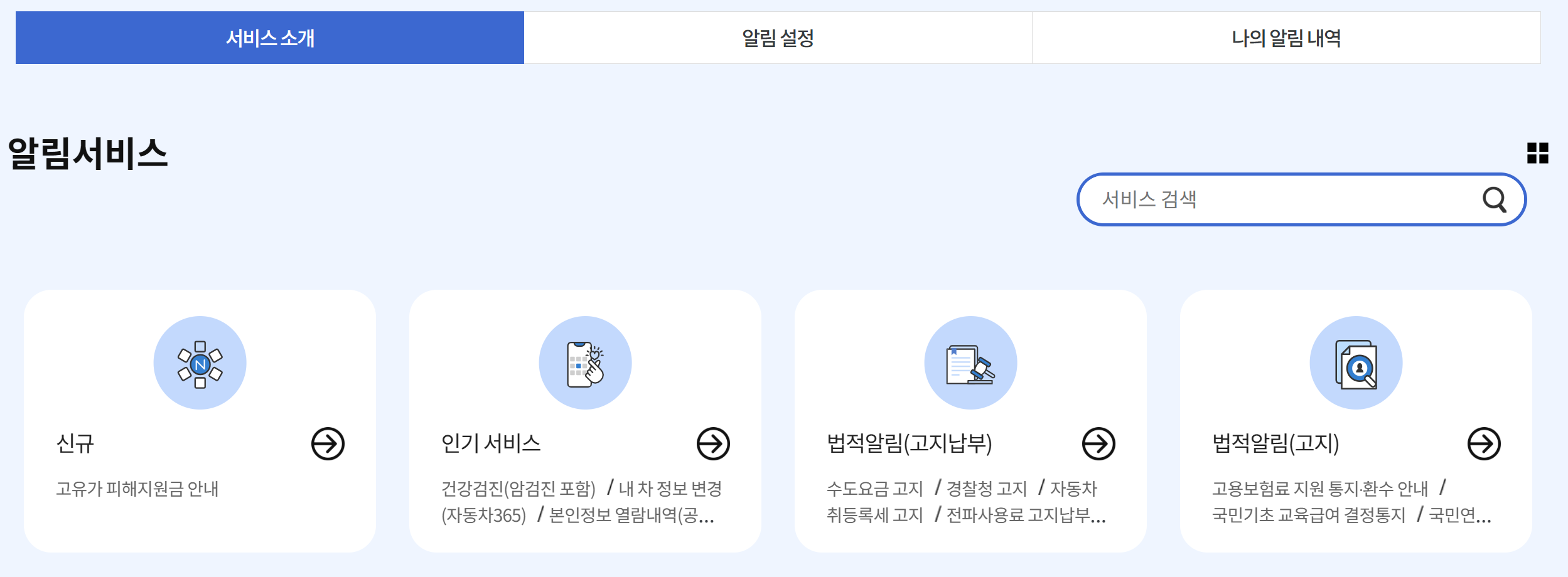 | 알림 항목 | 건강검진, 세금, 자동차, 민원 등 |